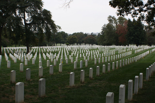 Out of the wind of the moving car we made it to the Cemetery. I remember moving past the statues and the visitor center where my Mother and Aunt pulled maps and information pamphlets. I remember us, the kids, growing quiet as we looked out across the path to the endless rows of white tombstones. Turning, more grave markers. Plain white marble with black writing. Couldn't begin to read them. Crosses, some Stars of David. Carefully placed flowers. A medal sitting on top of one marker - alone.